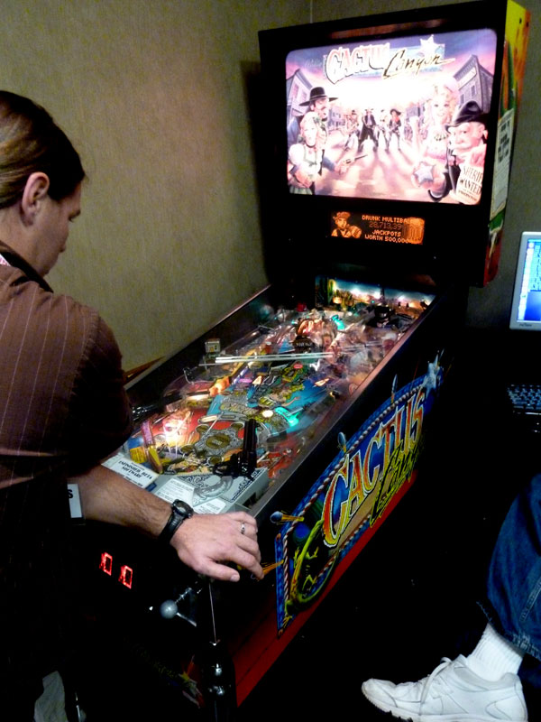 Mark got to play Cactus Canyon Continued — a CC game running with P-ROC, a cool board that lets you mod pinball games via a pc over usb. Mark reports: